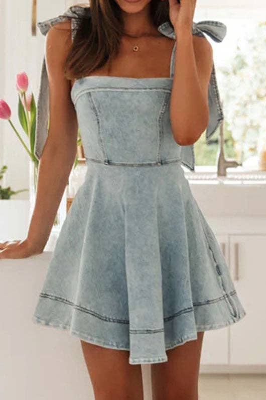 Bow Tie Denim Dress: LIGHT BLUE / S