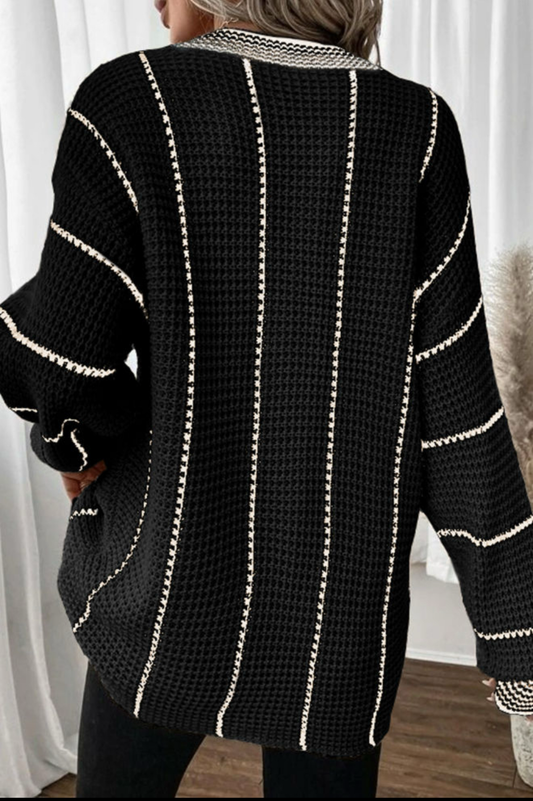 Black Colorblock Striped V Neck Knitted Loose Sweater